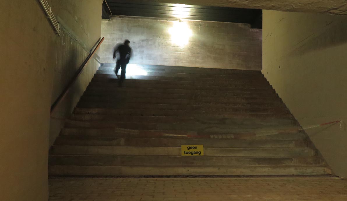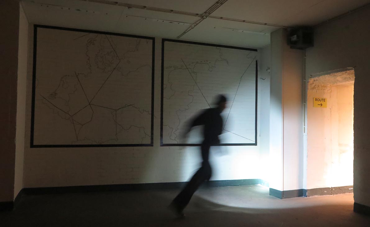 In Jeroen Jongeleen’s praktijk fungeert hardlopen als kunstvorm. Met zijn lichaam en inspanning raast hij door de gangen en zalen, op zoek naar een directe, fysieke dialoog met het gebouw. Met Diogenes’ Bunker, schetst Jongeleen een portret van het gebouw: een tijdelijk lege huls, op het punt om opnieuw in militair gebruik te worden genomen. Zijn guerilla running interventie ontvouwt zich als een tijdelijke ontmoeting met de historisch beladen, brute betonnen architectuur — een onderzoek naar hoe beweging en aanwezigheid een ruimte kunnen activeren en bevragen. ‘Antonius, Patron of Lost Meaning’ is een film opgenomen in een ziekenhuis dat onlangs is omgevormd tot een militair oefenterrein voor stedelijke oorlogsvoering. Jongeleen sloop naar binnen na sluitingstijd en verving onderweg de verschillende 'bewoners' van het gebouw door zelfgemaakte target-practice portretten.